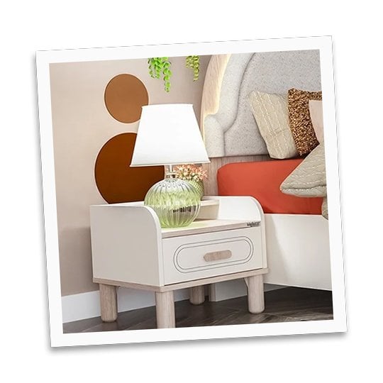 Masa üstü organizer + küçük çalışma lambası + şifonyer.