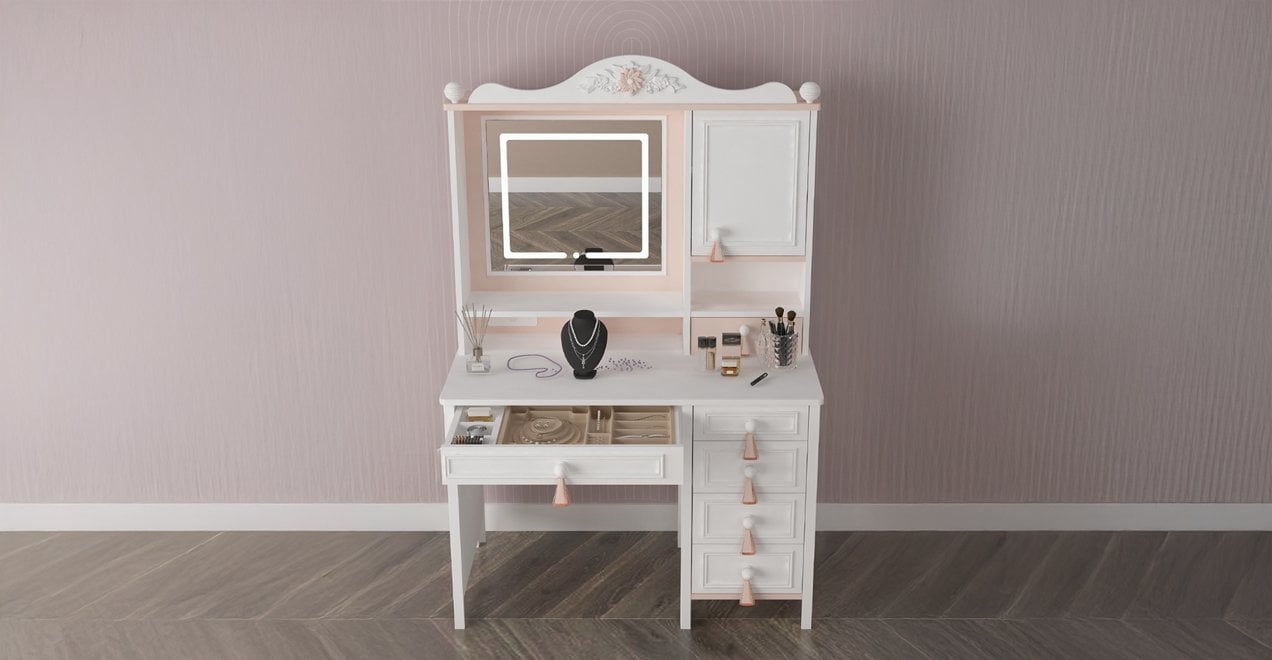 Geniş ve derin raflar, takı askısı ve kutu çekmece kasası ile işlevsel depolama alanı